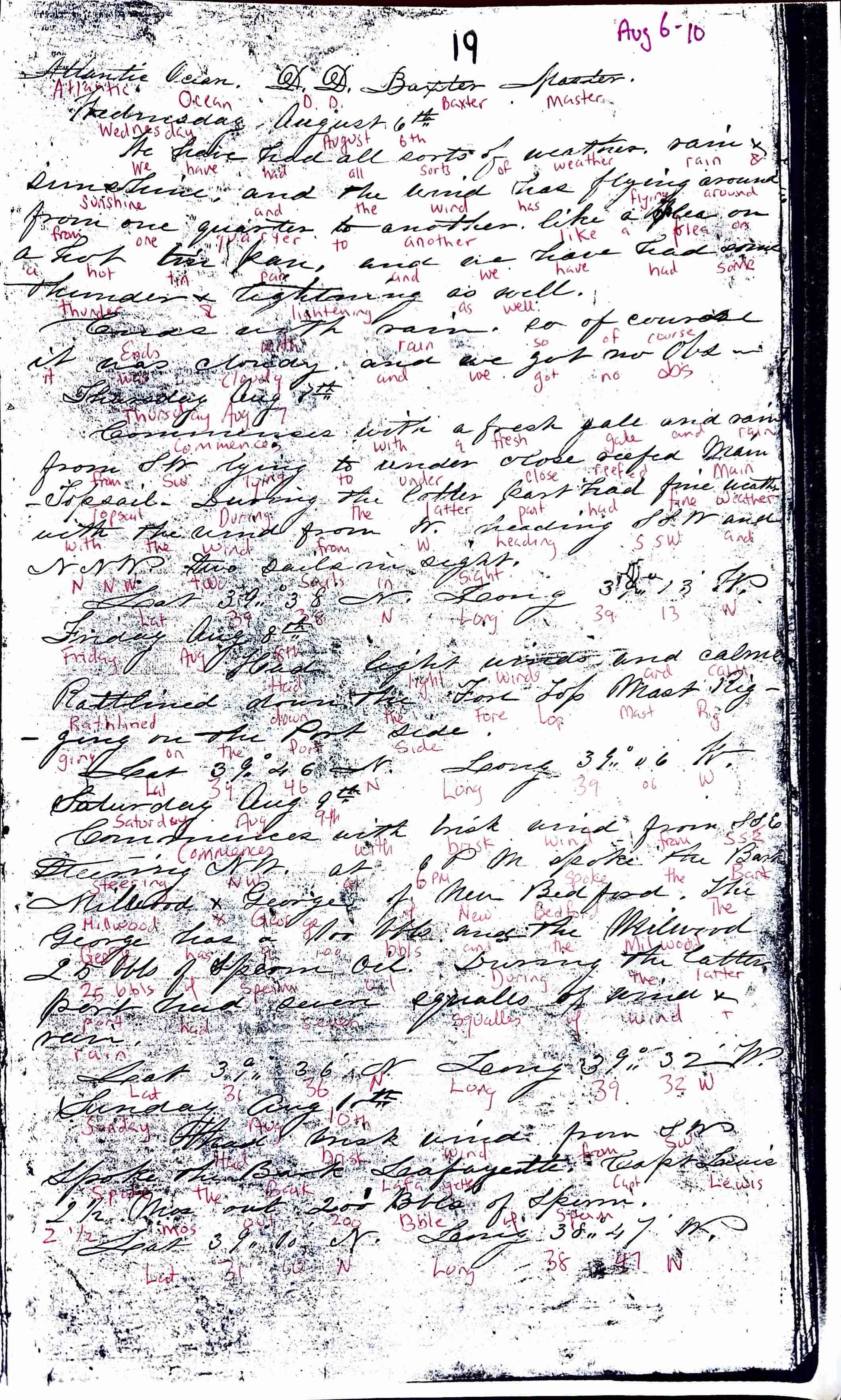 Commences with brisk wind from S SE. Steering NW. At 6pm spoke the Bark Millwood2 & George3 of New Bedford. The George has a 100 barrels and the Millwood 25 bbls of Sperm oil. During the latter port had seven squalls of wind & rain.