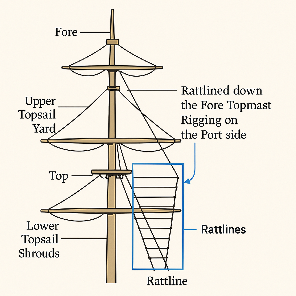 1 Rattlines (also spelled ratlines) are the horizontal lines that sailors tie between the vertical shrouds of a mast’s standing rigging. Together, shrouds + rattlines form the familiar rope ladder on the sides of a square-rigged vessel.
