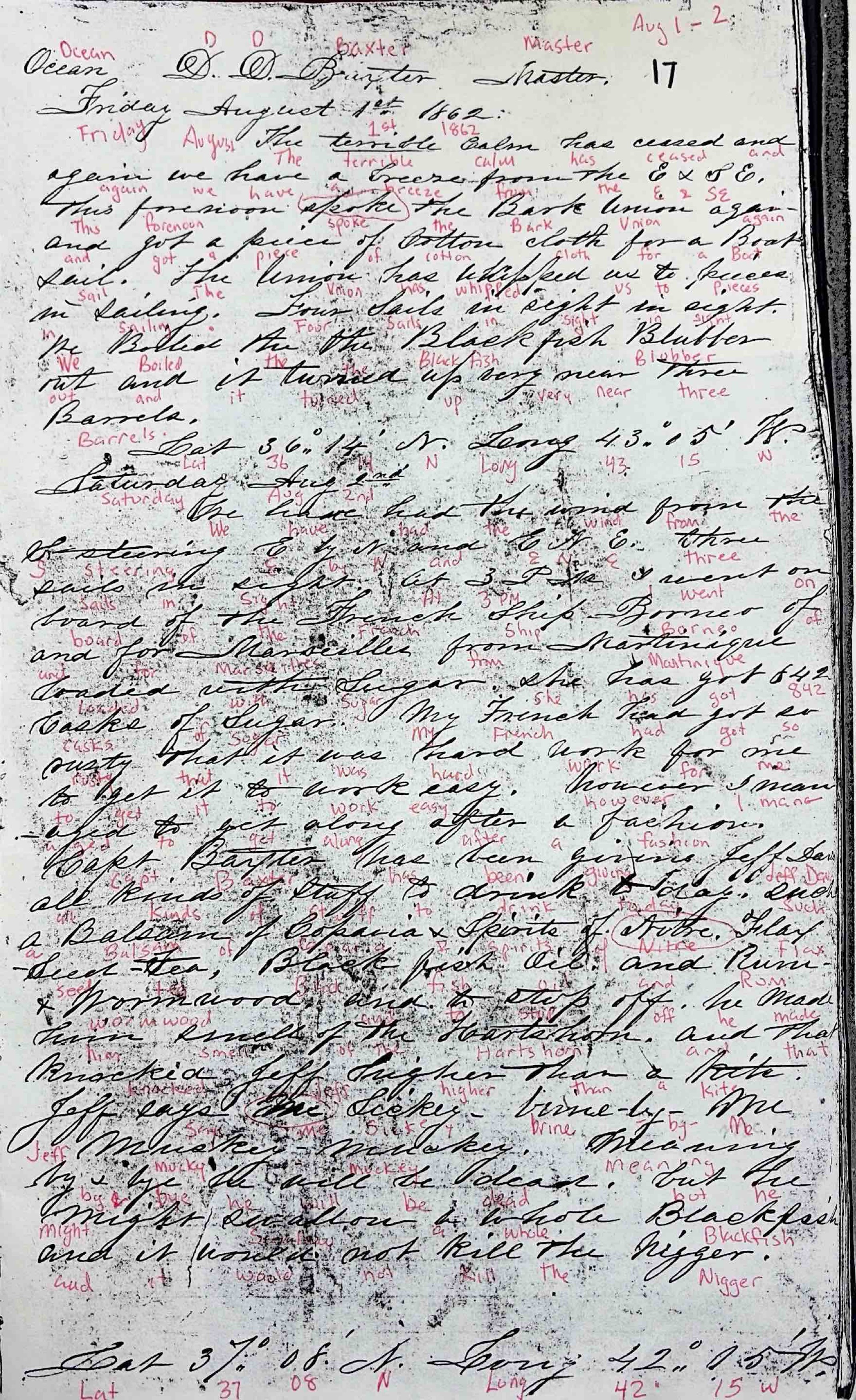 Capt Baxter has been giving Jeff Davis all kinds of of stuff to drink today. Such a Balsam of Copaiba4 & Spirits of Nitre5. Flax seed tea, Black fish oil and Rum & wormwood6 and to stop off he made him smell of the Hartshorn7. and that knocked Jeff higher than a kite8. Jeff says me sickey - brine-by-Me. Mucky - Mucky9. Meaning by & by he will be dead. but he might swallow a whole Blackfish and it would not kill the Nigger10.