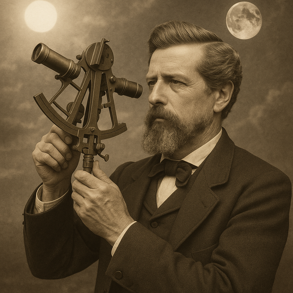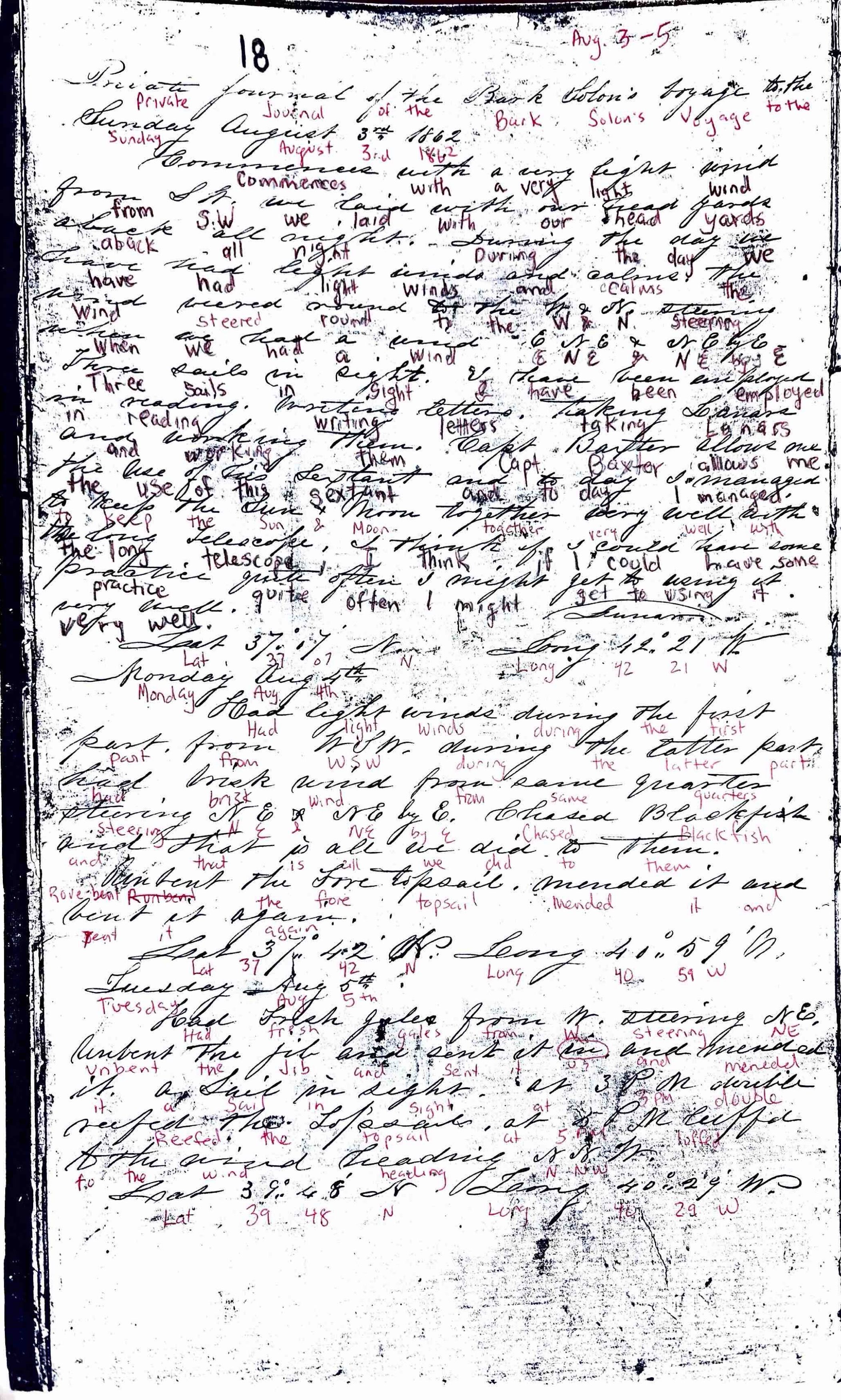 Commences with a very light wind from SW. we laid with out head yards aback1 all night. During the day we have had light winds and calms. the wind steered round to the W & N steering when we had a wind E NE & NE by E. Three sails in sight & have been employed in reading writing letters. taking Lunars and working them. Capt. Baxter allows me the use of this sextant and to day I managed to keep the Sun & Moon together very well with the long telescope I think if I could have some practice quite often I might get to using it very well.
