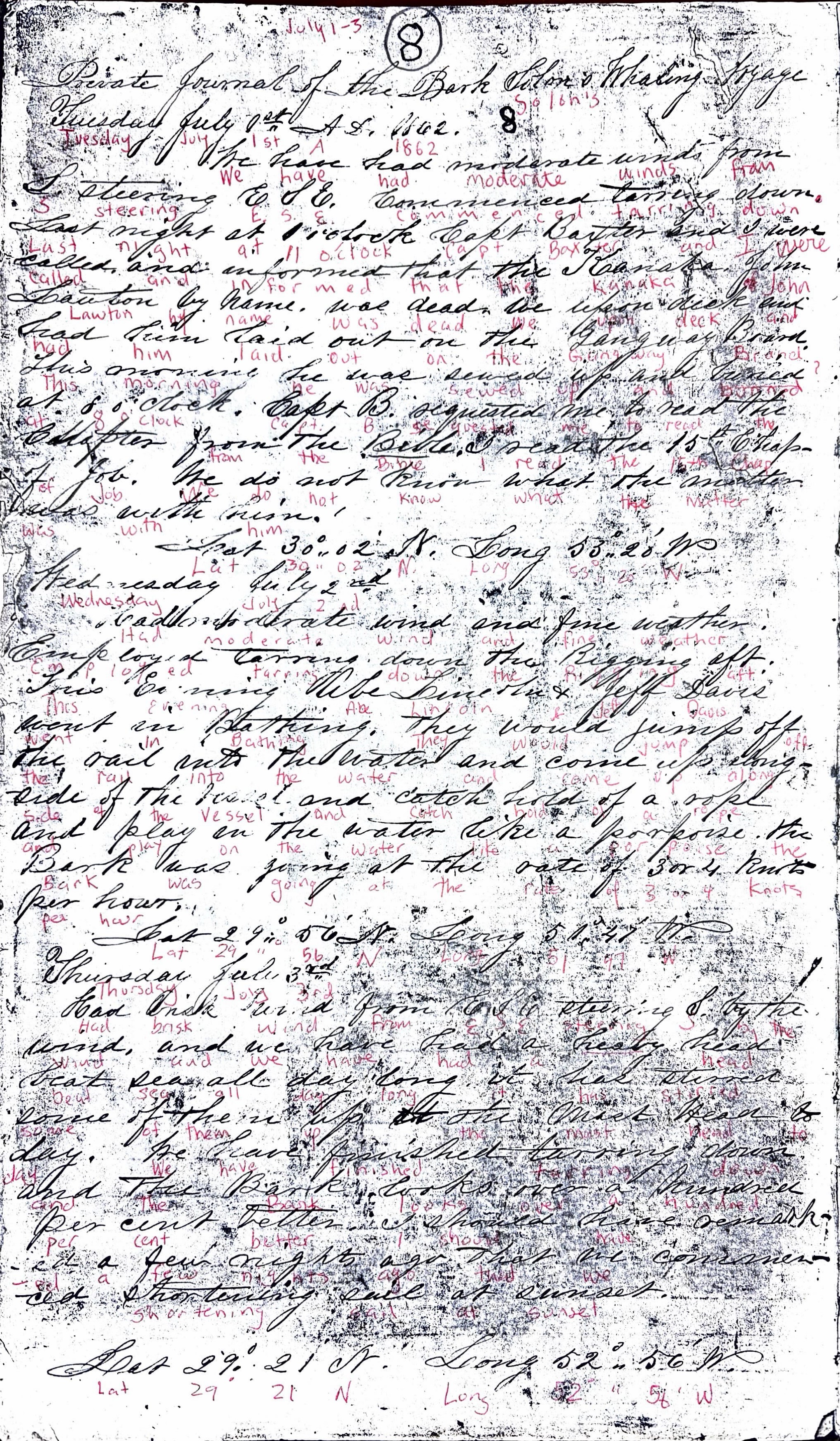 Had moderate wind and fine weather. Employed tarring down the Rigging aft. This evening Abe Lincoln and Jeff Davis went in bathing. They would jump off the rail into the water and come up along side the vessel and catch hold of a rope and play on the water like a porpoise. The Bark was going at the rate of 3 or 4 knots per hour.