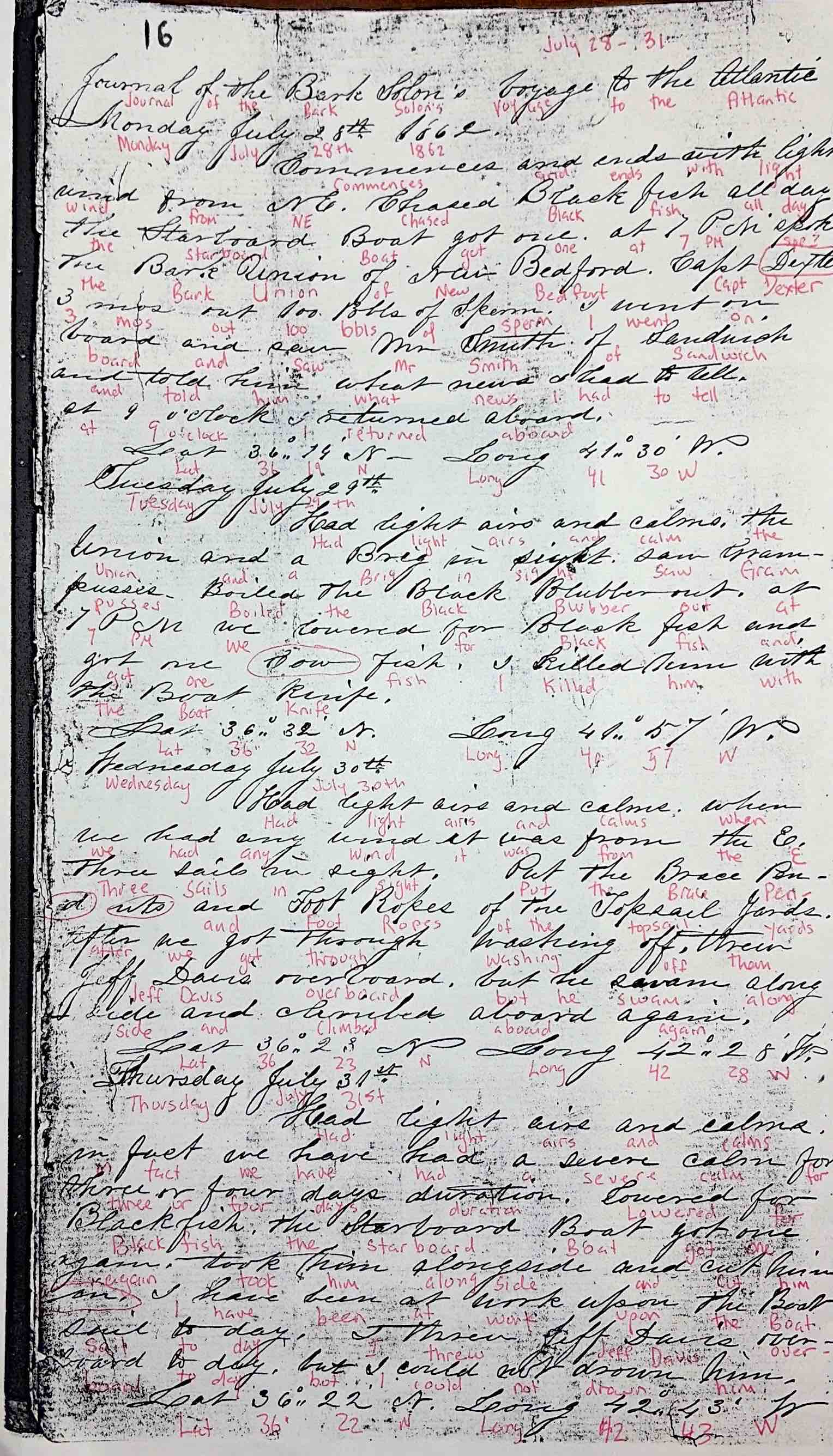 Had light airs and calms. in fact we have had a severe calm for three or four days duration. Lowered for Blackfish. the Starboard Boat got one again. took him alongside and cut him in. I have been at work upon the Boat sail to day. I threw Jeff Davis over board to day but I could not drown him.