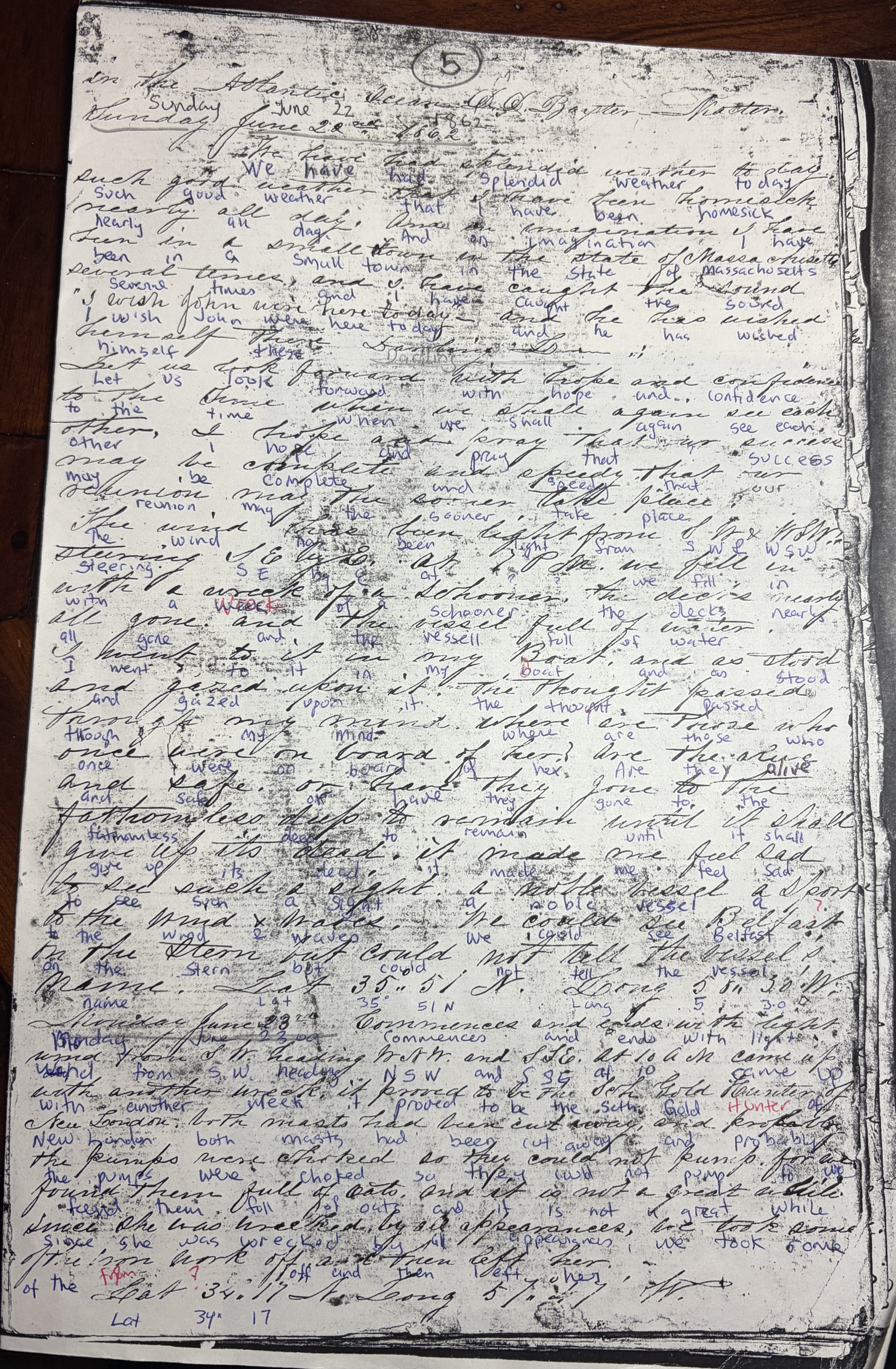 The wind has been light from S. W & W S W steering S E by E at 7 pm. We fell in with a wreck of a schooner the decks nearly all gone and the vessel full of water. I went to it in my Boat and as stood and gazed upon it. The thought passed through my mind where are those who once were on board of her? Are they alive have and safe or have they gone to the fathomless deep to remain until it shall give up its dead.