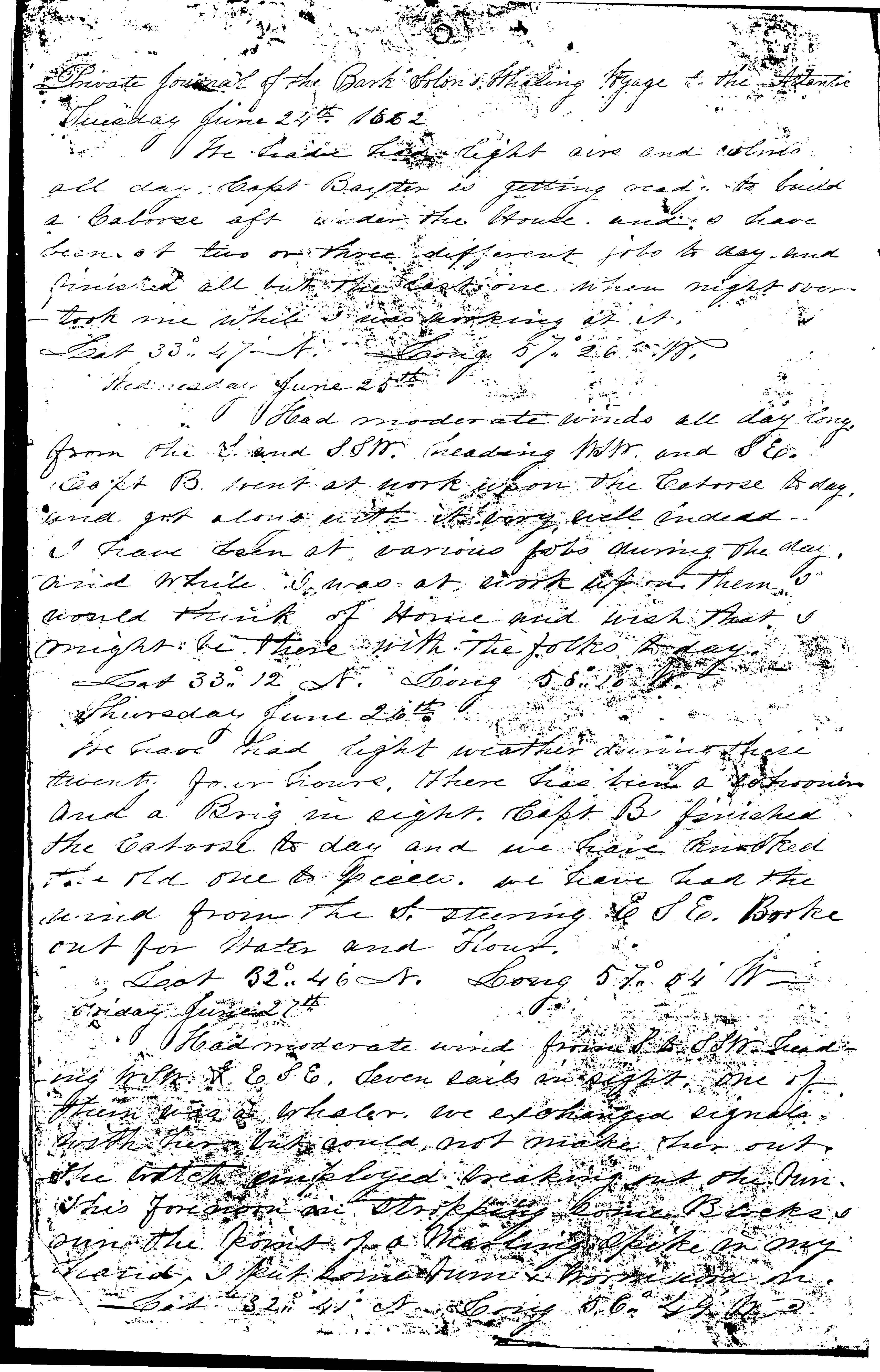 Had moderate winds all day long from the S and S.W. heading north and SE. Capt B. went at work upon the caboose today and got along with it very well ended. I have been at various jobs during the day and while I was at work upon them I could think of home and wish that I might be there with folks today.