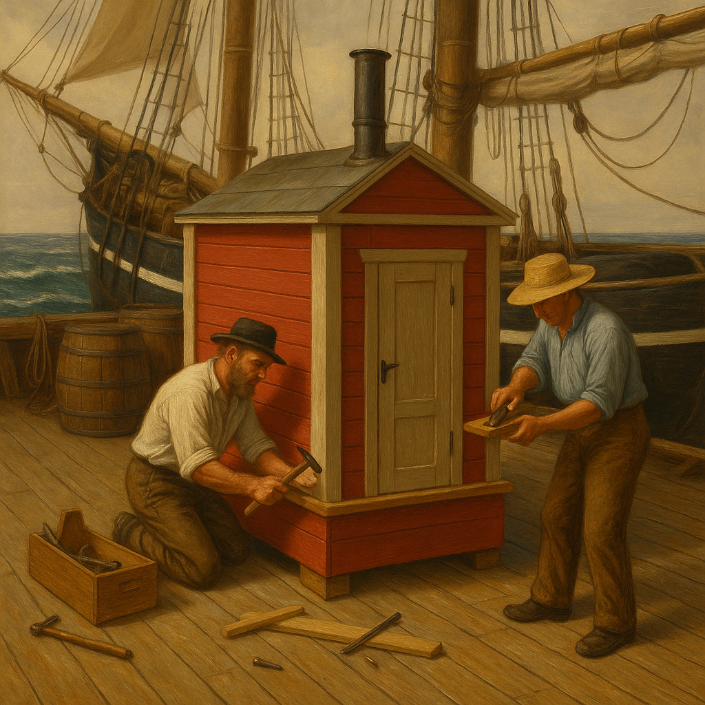 We have had light weather during these twenty four hours. There has been a schooner and a Brig in sight. Capt B finished the caboose to day and we have knocked the old one to pieces. We have had the wind from the S steering E. & E.S.W. Bark out for water and flour.