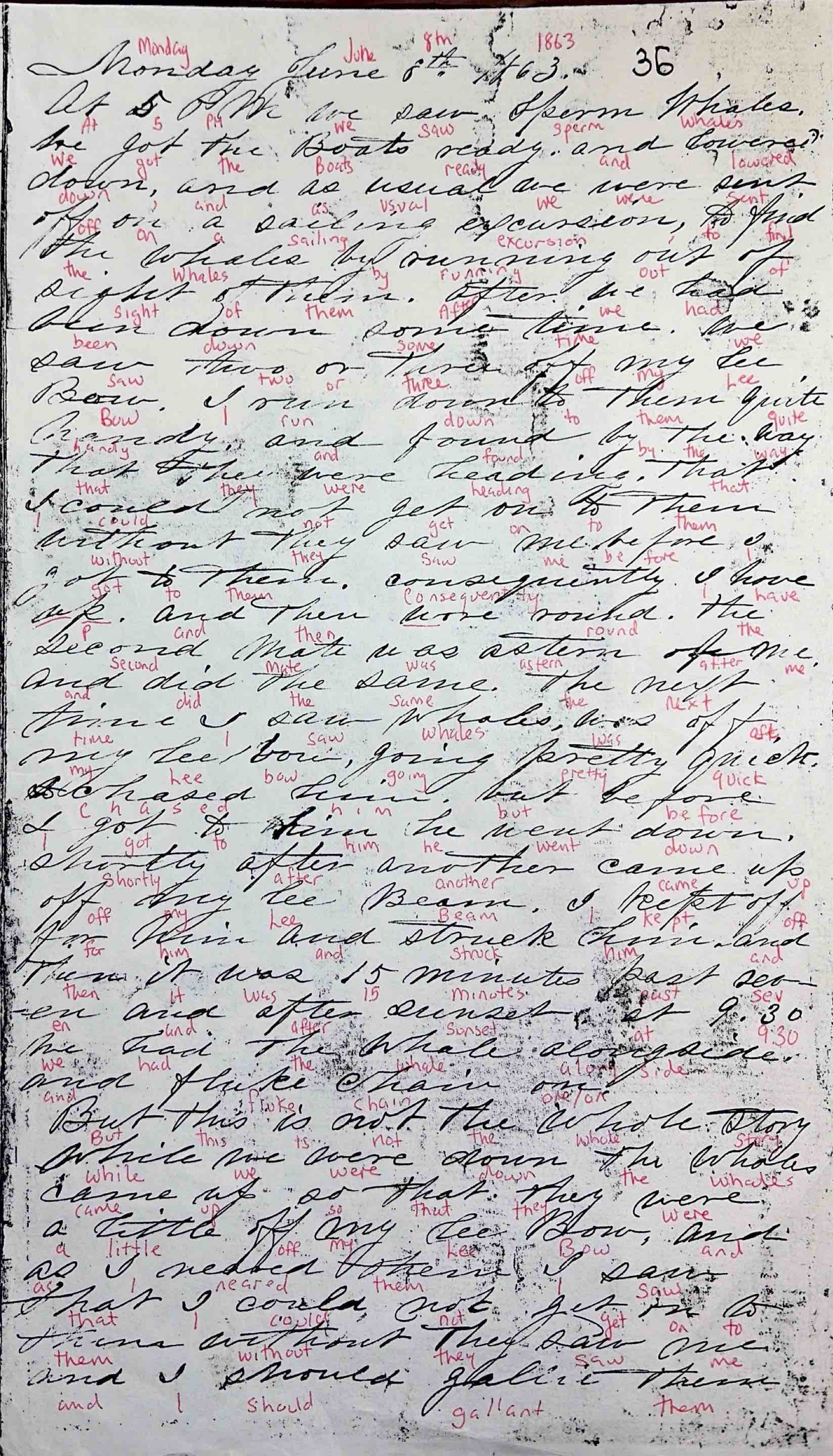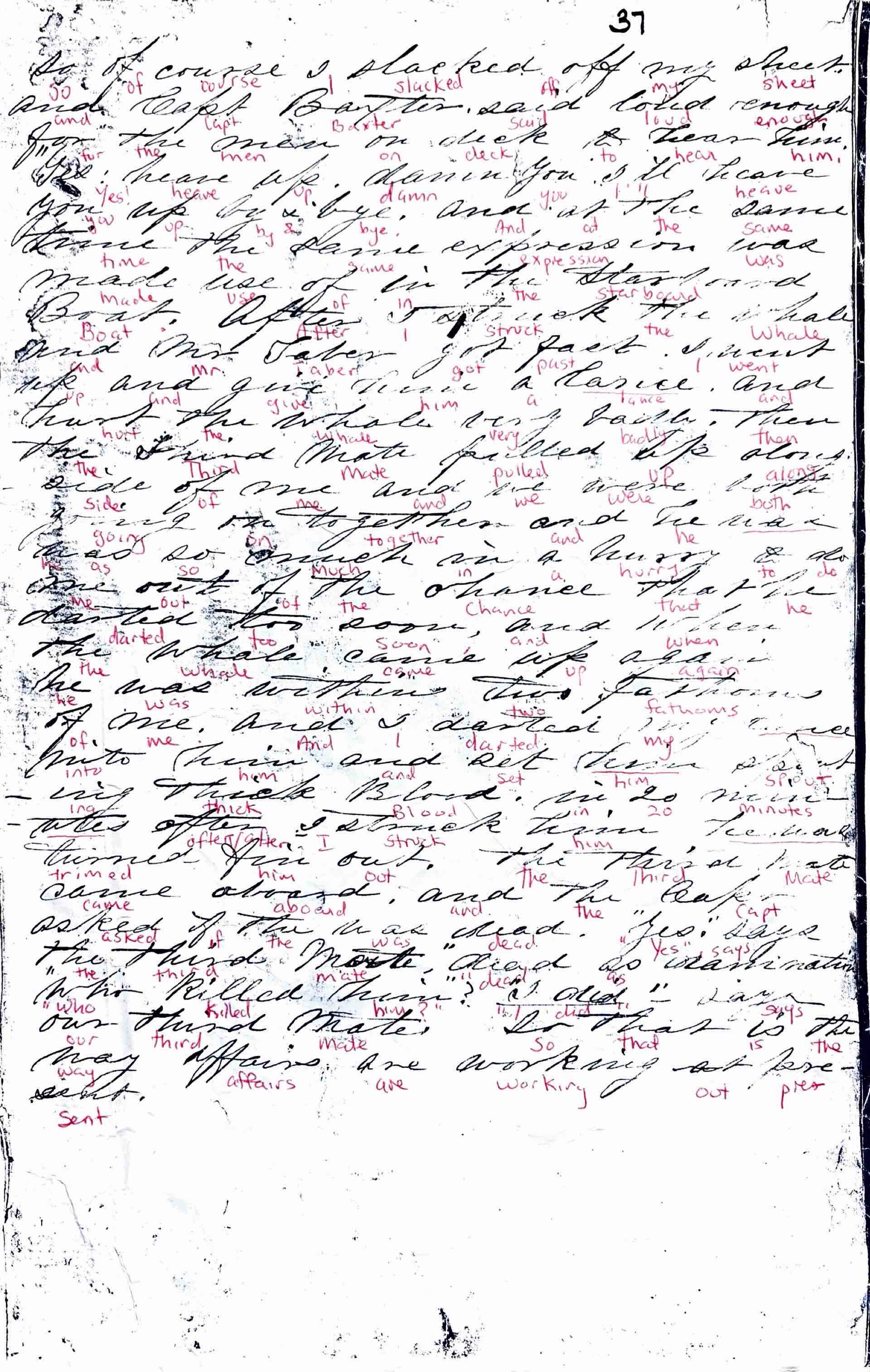 After I struck the whale and Mr. Taber got past I went up and give him a lance. And hurt the whale very badly then the Third Mate pulled up along side of me and we were both going on together and he was so much in a hurry to do me out of the chance that he darted too soon6 and when the whale came up again he was within two fathoms of me7. And I darted my lance into him and set hm spouting thick Blood8. In 20 minutes after I struck him he had turned fin out9.