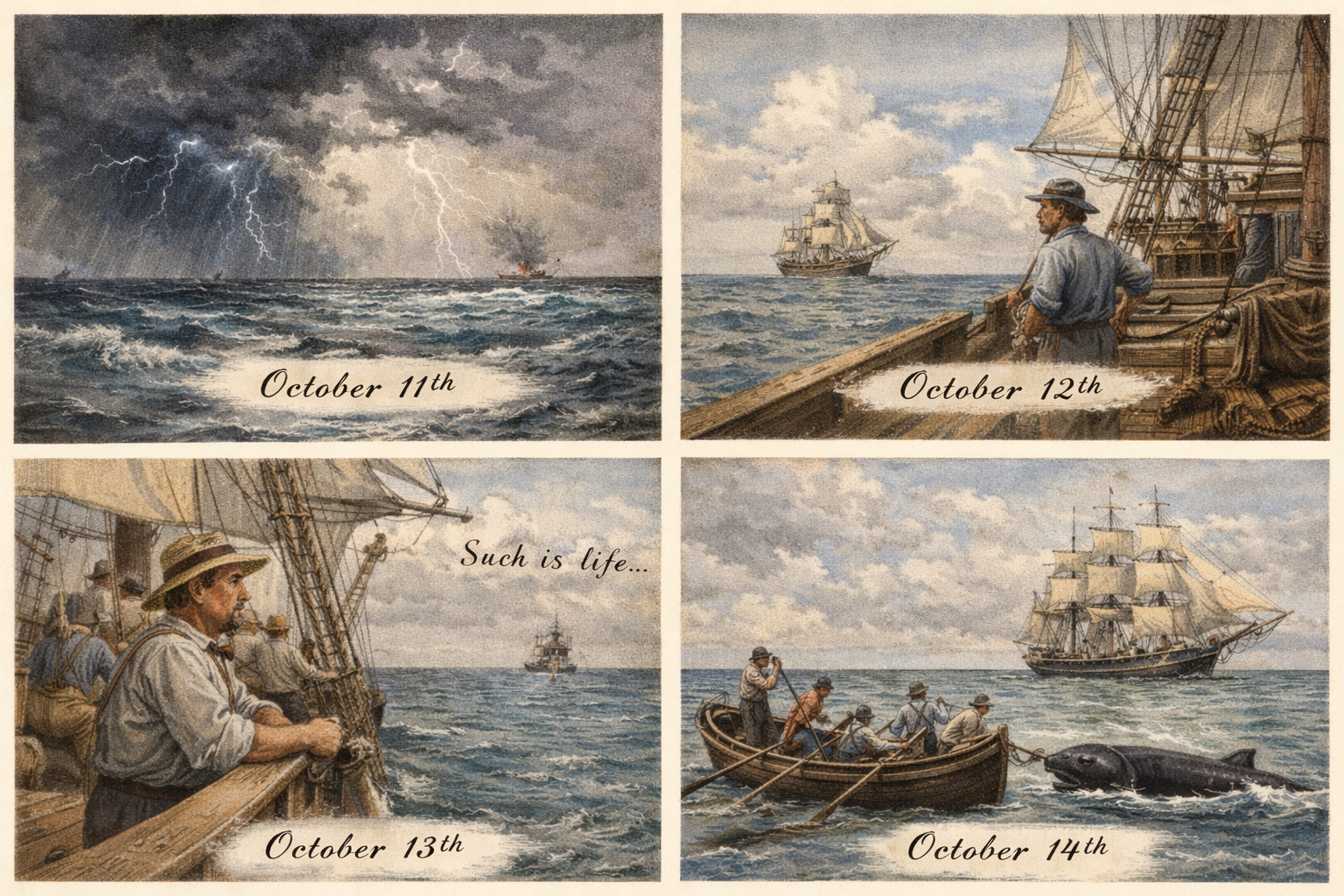 Commences with fine weather. And moderate wind from various quarters. Steering S. During the middle part had a rain squall from the W and Ends with fine weather.