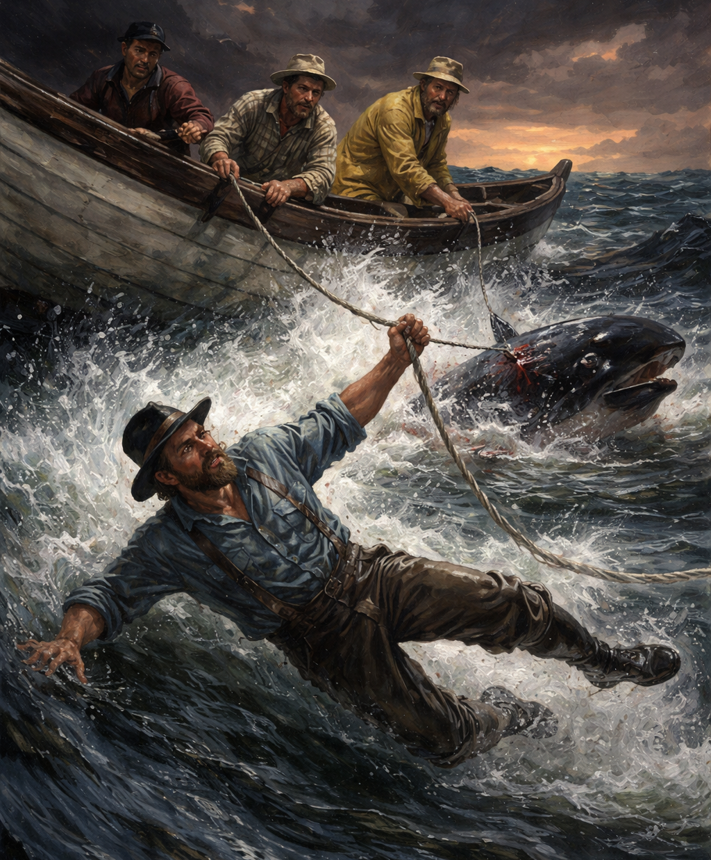 2 In Blackfish (pilot whale) hunting, the iron was attached to a long, coiled line that could surge violently under load; when the whale sounded or changed direction in darkness, the strain and chafe could cause the iron to part or tear free, abruptly ending the fast.