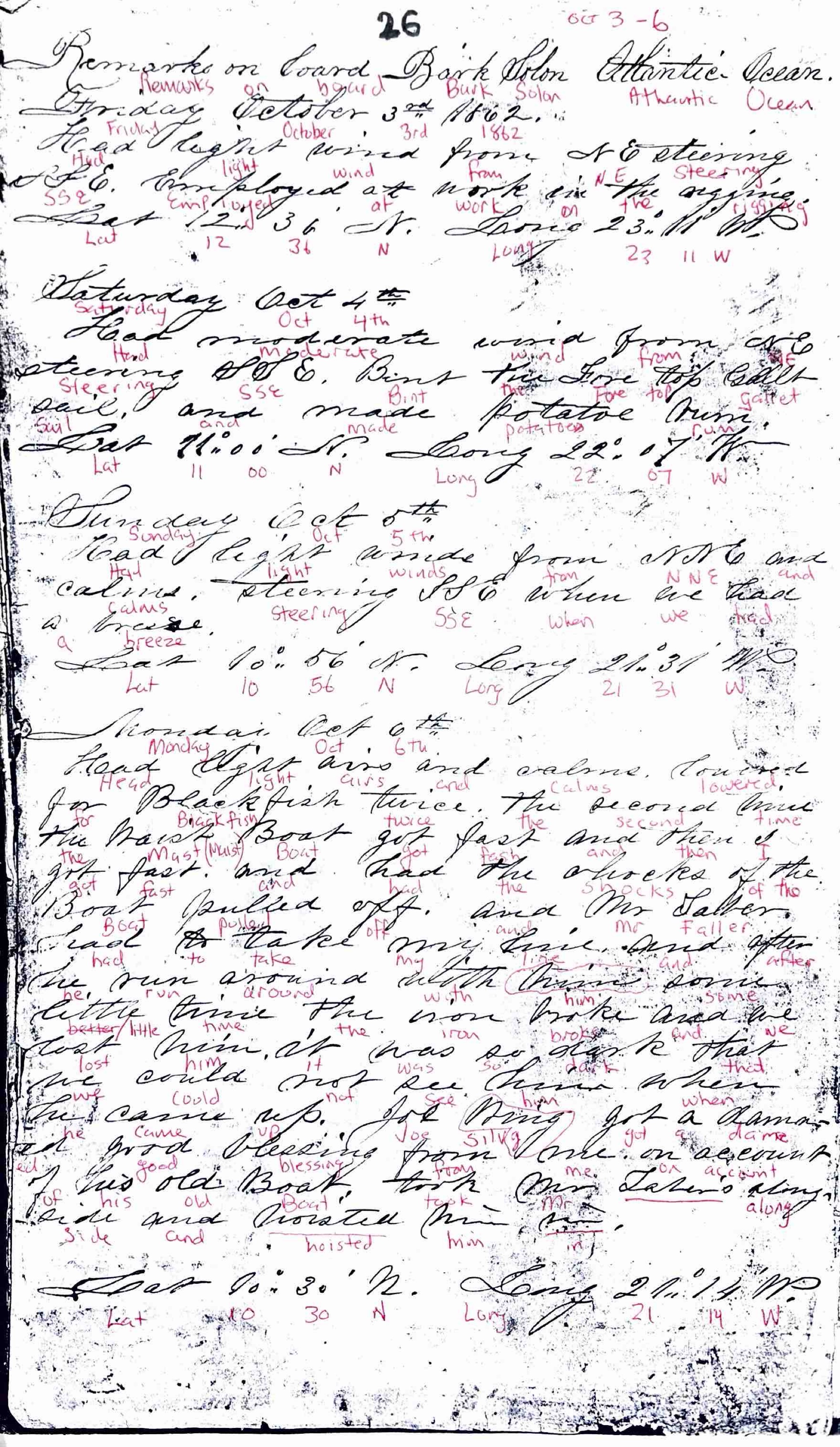 Head light airs and calms lowered for Blackfish twice. The second time the Mast Boat got fast and then I got fast. And had shocks of the Boat pulled off. And Mr Faller1 had to take my line and after he run around with him some little time the iron broke2. And we lost him. It was so dark that we could not see him when he came up. Joe ????3 got a damned good blessing from me on account of his old Boat took Mr. Faller’s along side and hoisted him [in].