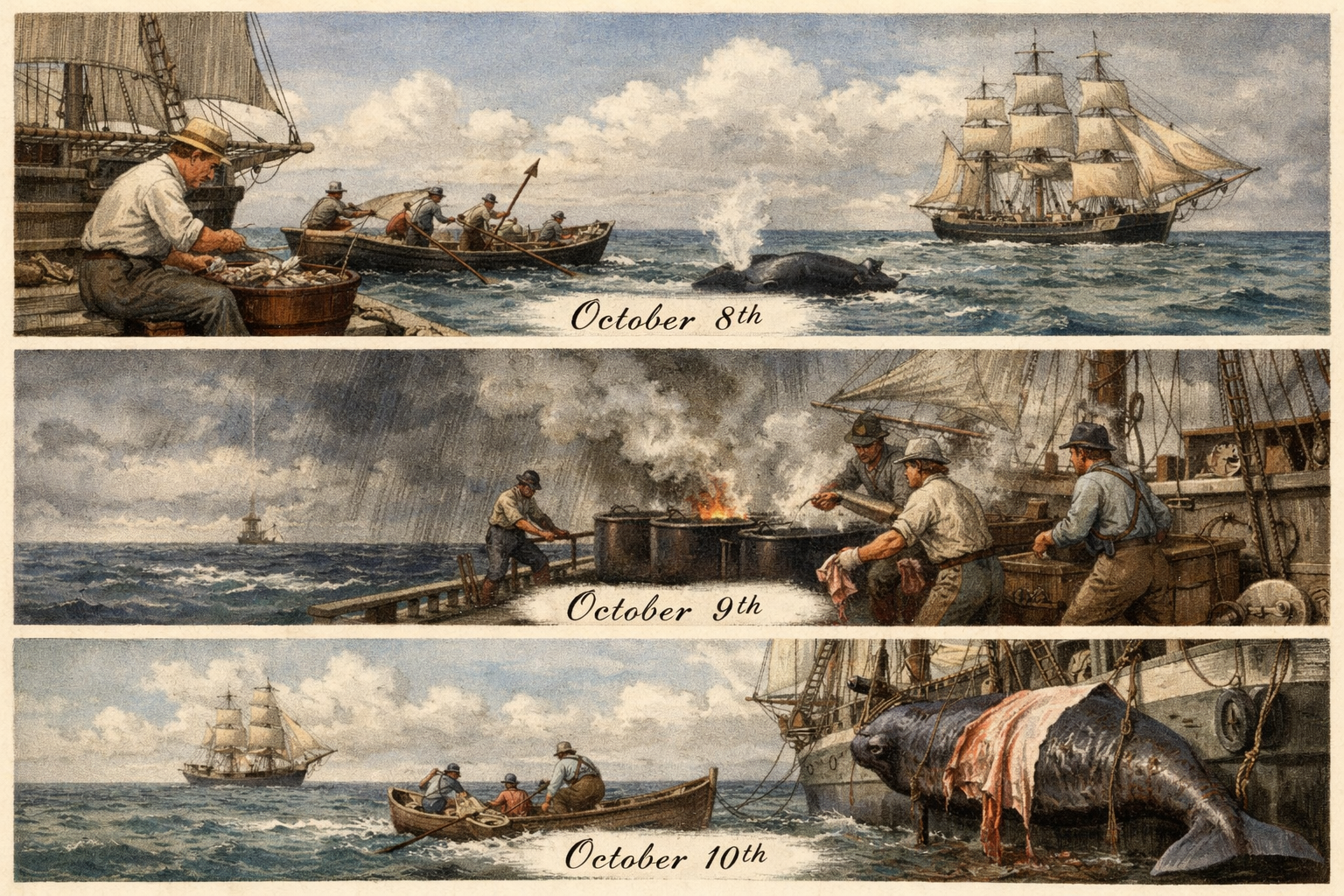 2 Boiling during squally weather indicates urgency—fresh blubber spoiled quickly in tropical heat.