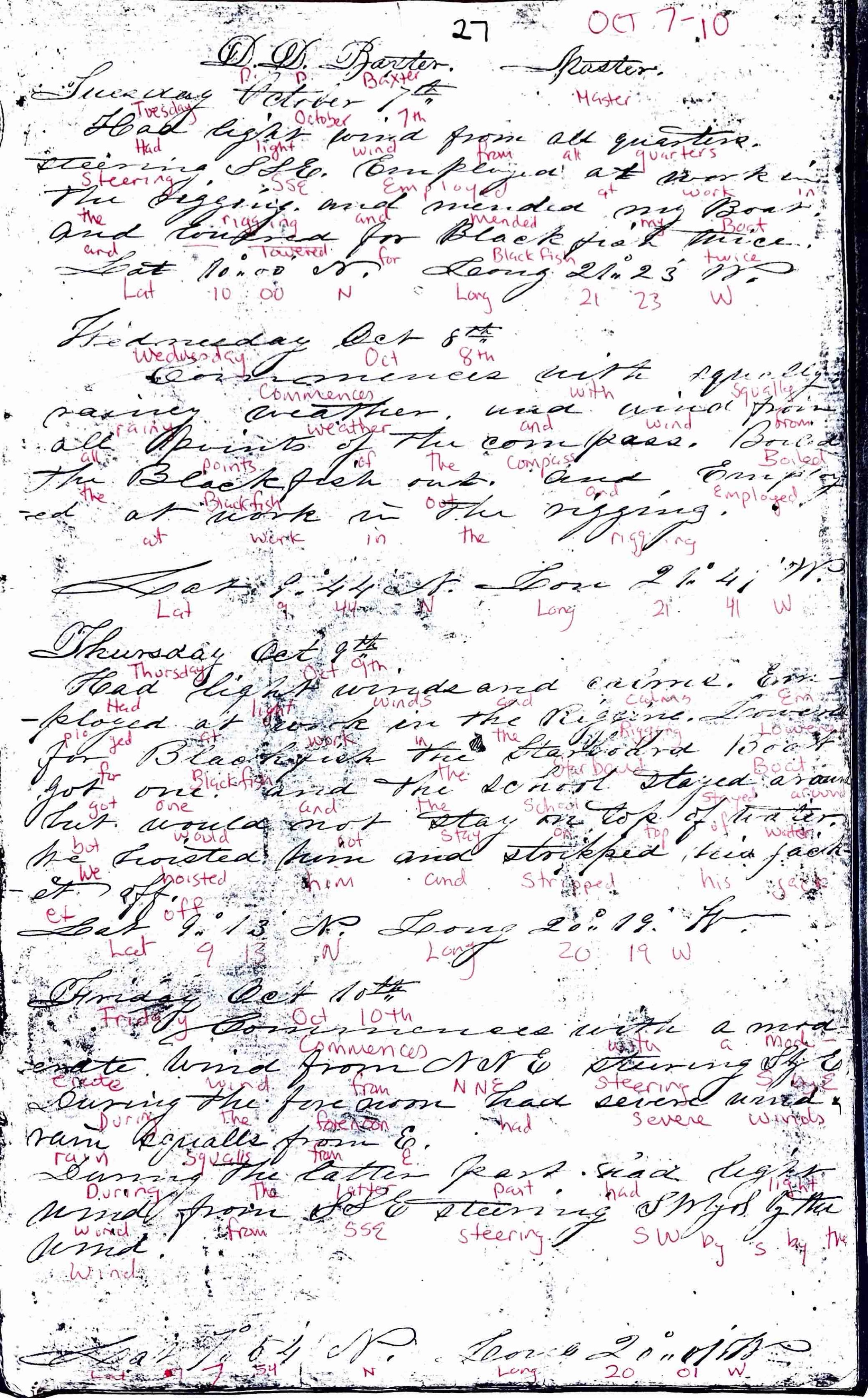 Had light wind from all quarters. Steering S S E. Employed at work in the rigging and mended my Boat. And lowered for Blackfish twice1.