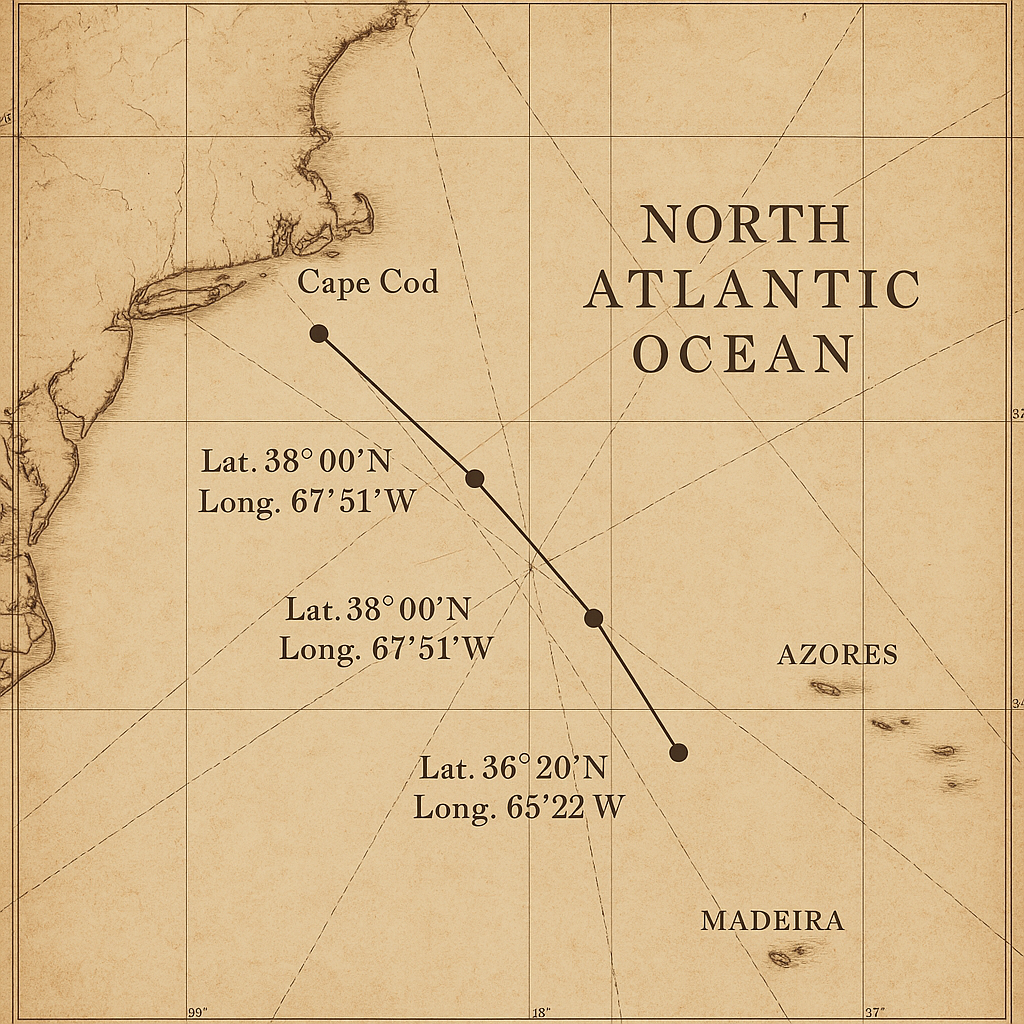 Lat. 38° 00′ N — Long. 67° 51′ W