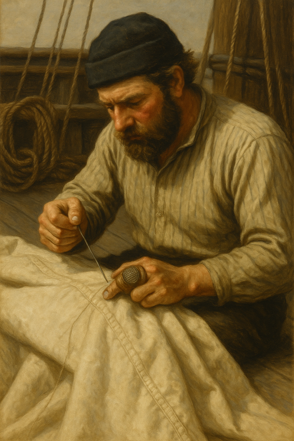 We have had brisk wind from NE until this morning. I have been employed turning up the Fore Rigging and while in the act of snipping a lanyard I ran a sail making needle4 in the ball of my hand. And injured it so much that I have been unable to use it. And it is now quite sore. During the day we have had light wind and variable. Set up Fore topsail stay.