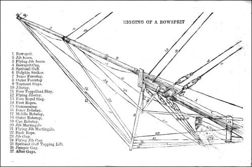Commences with moderate wind from N NE. Steering S. SW. Ends the same. Employed setting up the Jib & Flying Jib guys1. And bowsprit shrouds2. Ends with light winds.