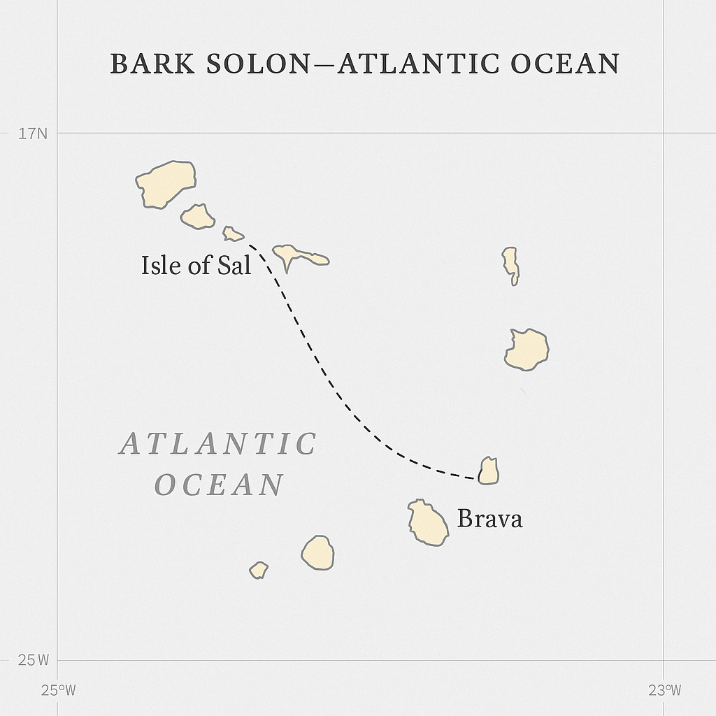 Brava (Ilha Brava) is the southwesternmost island of Cape Verde, historically known as the green island because it is more fertile than Sal. In the 19th century it was a familiar and socially connected landfall for whalers, with small anchorages such as Fajã d’Água, where shore relationships, provisioning, and brief leave were common.