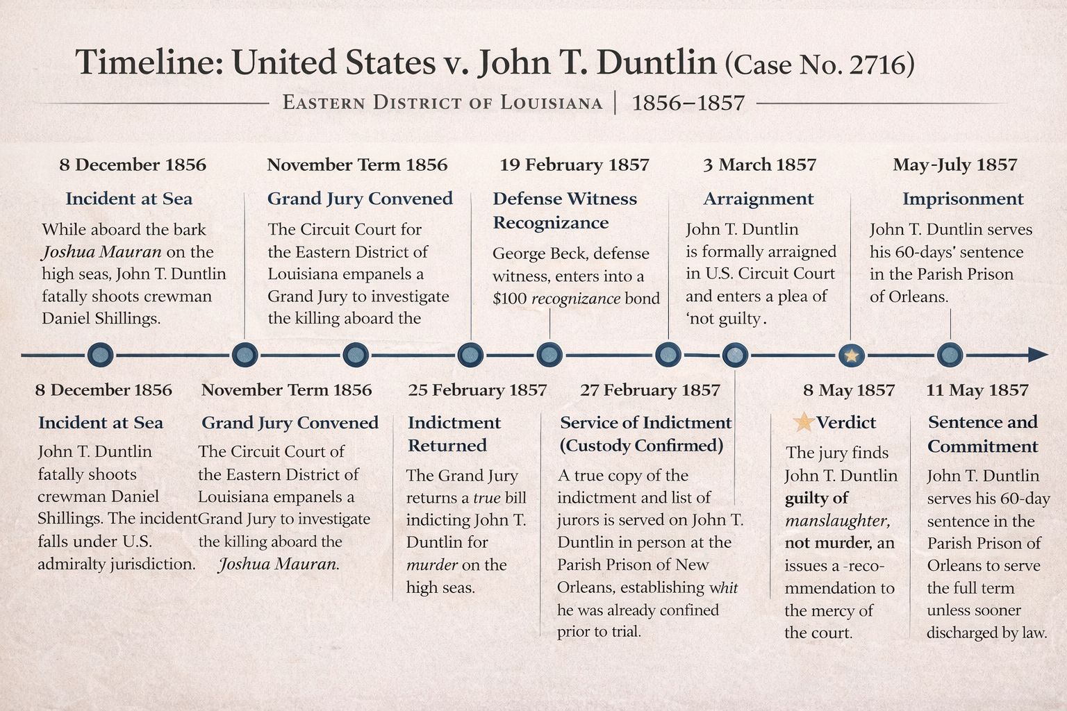 In the November Term of 1856, the Grand Jury of the United States Circuit Court for the Eastern District of Louisiana began proceedings against John T. Duntlin, a seaman and officer of the bark Joshua Mauran. The charge arose from an incident at sea on 8 December 1856, during which Duntlin fatally shot Daniel Shillings, a fellow crew member, aboard the vessel while it was on the high seas and thus within the admiralty and maritime jurisdiction of the United States.