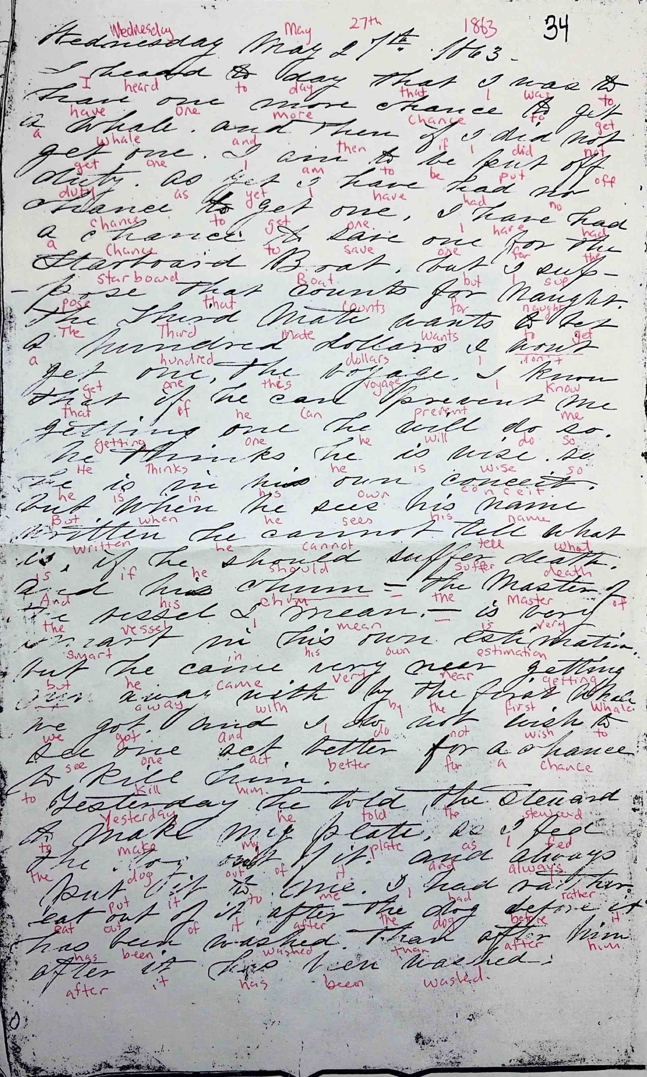 The Third Mate wants to get a hundred dollars [if] I don’t get one this voyage. I know that if he can prevent me getting one, he will do so. He thinks he is wise, so he is in his own conceit. But when he sees his name written he cannot tell what is if he should suffer death4. And his chum - the Master of the vessel, I mean - is very smart in his own estimation. But he came very near getting push away with by the first Whale we got5. And I do not wish to see one act better for a chance to kill him.
